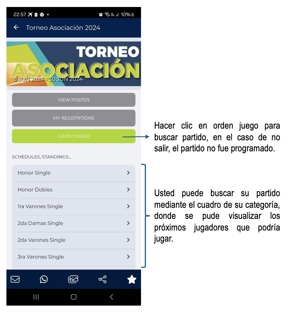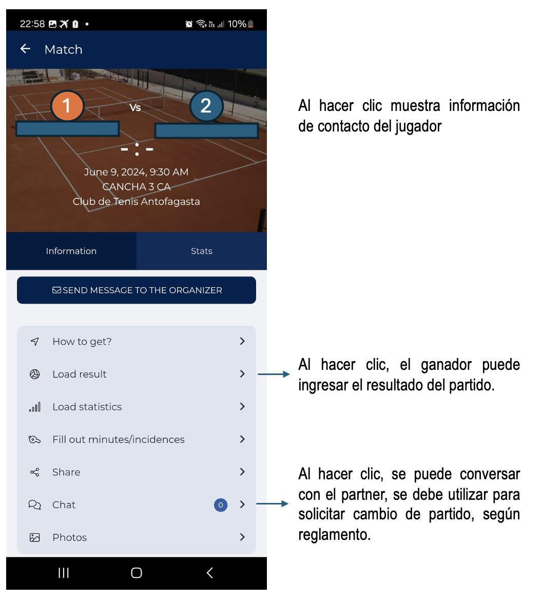 En el caso en que un jugador desee modificar un partido, debe utilizar el chat de la app para dejar registro de conversación sostenida con el partner. Según reglamento la solicitud de modificación se puede realizar, respetando la decisión del partner. (importante leer reglamento para visualizar opción)